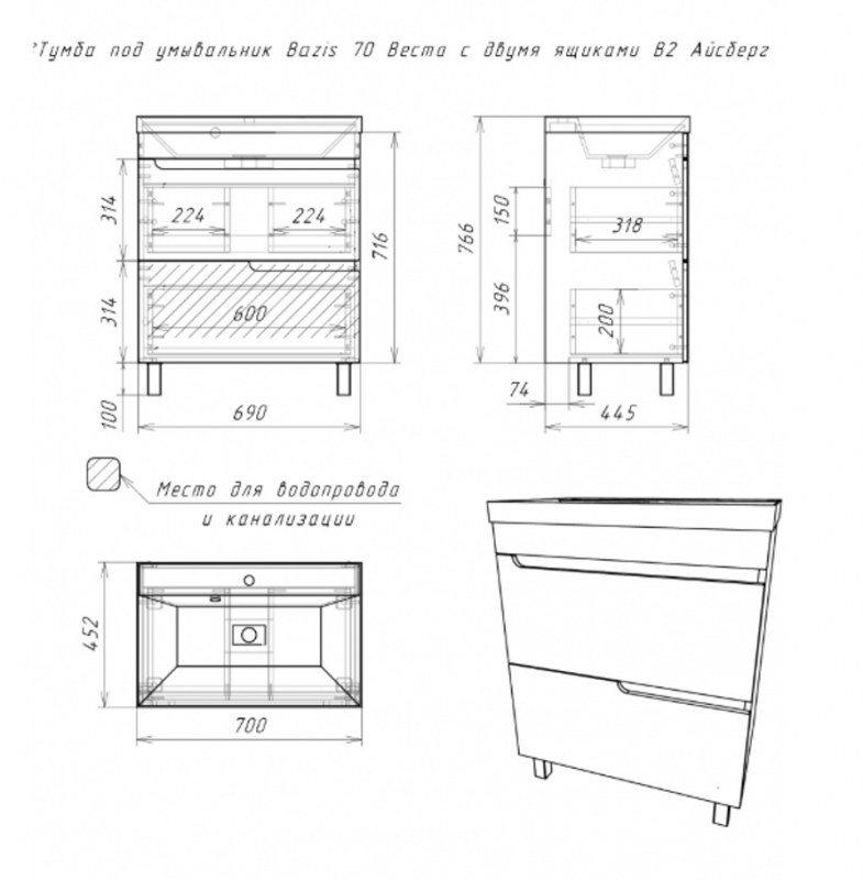 Тумба под ум. "Bazis 70" Веста с двумя ящ. В2 Айсберг DV5907T Домино
