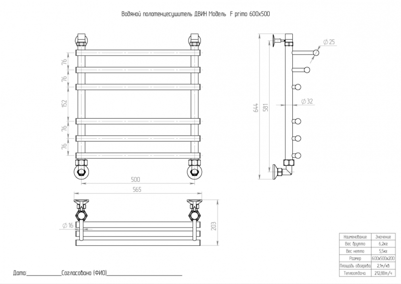 Полотенцесушитель ДВИН F Primo 60/50 Водяной (1"-3/4"-1/2" К3 Золотой матовый) ДВИН